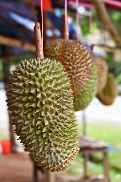 By the way, this photo of the Durian, King of Fruits was taken in a road-side fruit stand enroute to the hilltop tropical farm